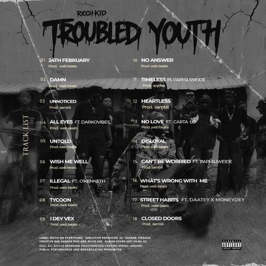 Ghanaian sensational artist Ricch Kid has finally blessed music lovers with his highly anticipated project, “Troubled Youth.” This 13-track masterpiece captures raw emotions, street struggles, and the resilience of a generation determined to rise above challenges.